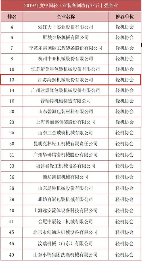 由中國輕工機(jī)械協(xié)會推薦的有22家企業(yè)榮登2019年度中國輕工業(yè)裝備制造行業(yè)五十強(qiáng)榜單,海獅機(jī)械排名第13位。