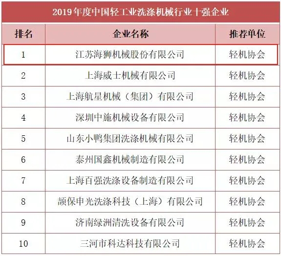 由中國輕工機(jī)械協(xié)會推薦,與中國輕工業(yè)聯(lián)合會共同評選出2019年度中國輕工業(yè)洗滌機(jī)械行業(yè)十強(qiáng)企業(yè),海獅機(jī)械排名第1位。